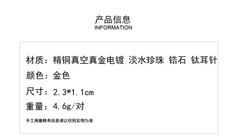 简介:精铜真空真金电镀 淡水珍珠 锆石 钛耳针 4.6g/对 整件大小2.3*1.1cm